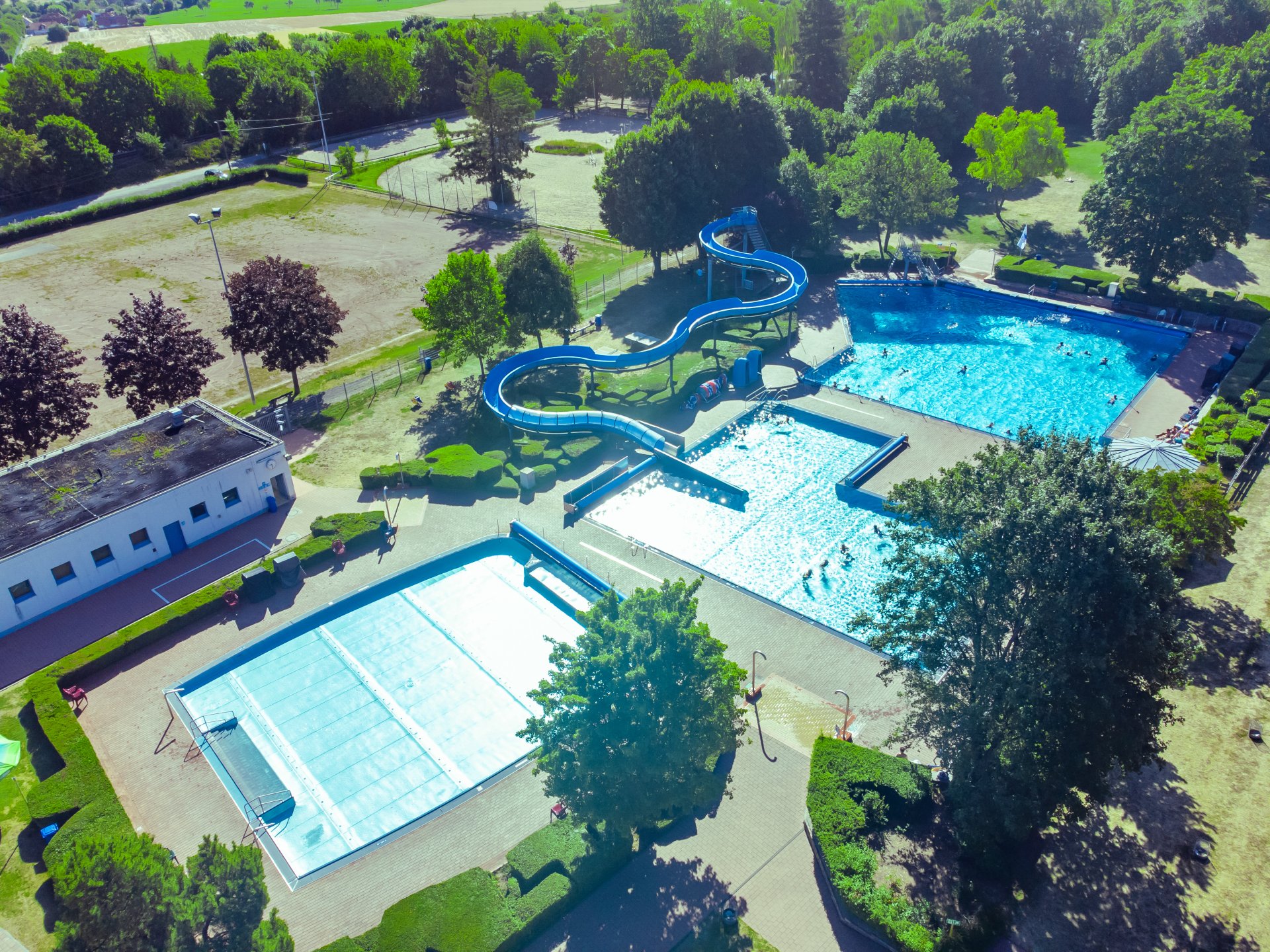Sicht auf das Schwimmbecken, das ein Meter-Brett sowie das Drei-Meter-Brett und die lange blaue Rutsche.