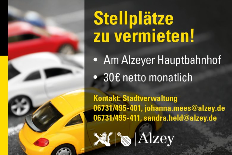 - Ab sofort hat die Stadt Alzey Stellplätze im abgeschlossenen Innenhof in der Mainzer Straße zu vermieten! Sei es als Parkplatz für Autos oder Anhänger. Die Kosten pro Stellplatz im Innenhof liegen bei 35 € monatlich.