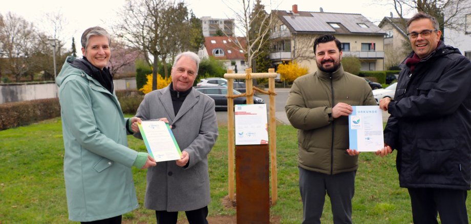 Das sichtbare Zeichen für die Zertifizierung ist die Pflanzung eines Nachhaltigkeitsbaumes auf dem Gelände der Aumühle – der Einrichtung für Menschen mit Behinderung: Die Wahl fiel auf einen Ginkgo, der in der Welt der Pflanzen als „lebendes Fossil“ eine besondere Rolle einnimmt. Der Baum wurde am 25. März von Özgür Pektas, Referent für Energie und Umwelt der IHK Darmstadt, Maike Henningsen, Sprecherin der Geschäftsführung von Mission Leben, Pfarrer Florian Gärtner, Geschäftsführer Personal, Axel Rothstein, Leitung Nachhaltigkeits- und Qualitätsmanagement anlässlich der Übergabe der Zertifikate gepflanzt.